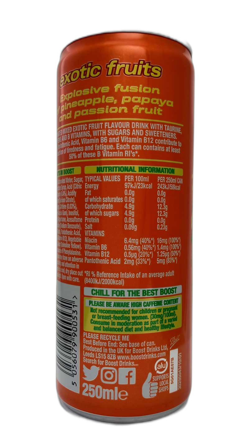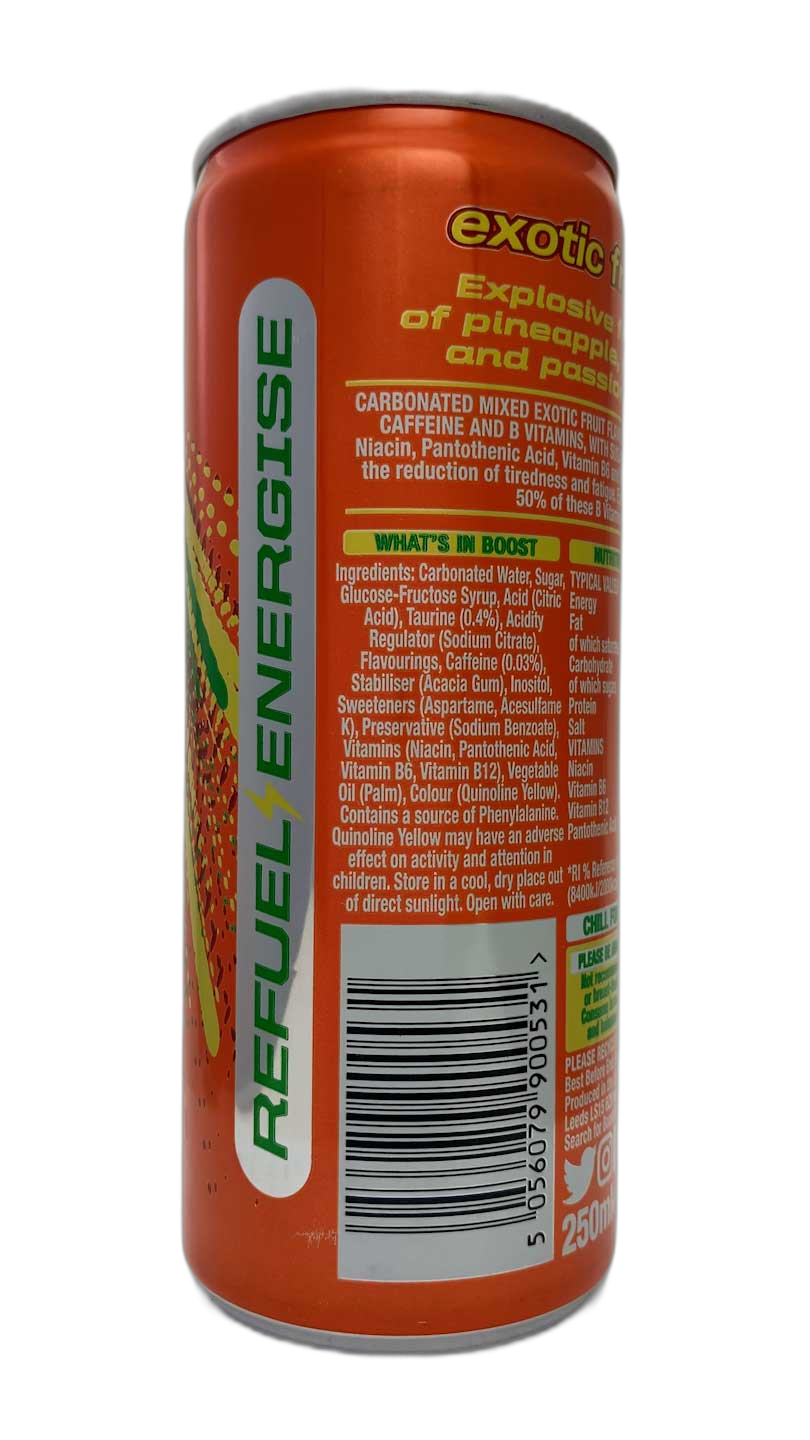 Continuing the range of colour-interchangeable Boost Cans is a brazilian feeling orange/yellow/green combination. I can see what they were going for relating to the exotic fruits flavour but I don’t think the chosen colours work well in combination. Where is causes most problem is in the ‘Important Information’ panel on the rear where the green text on yellow background is almost unreadable. Unfortunately, I’m not a fan of this overall design.