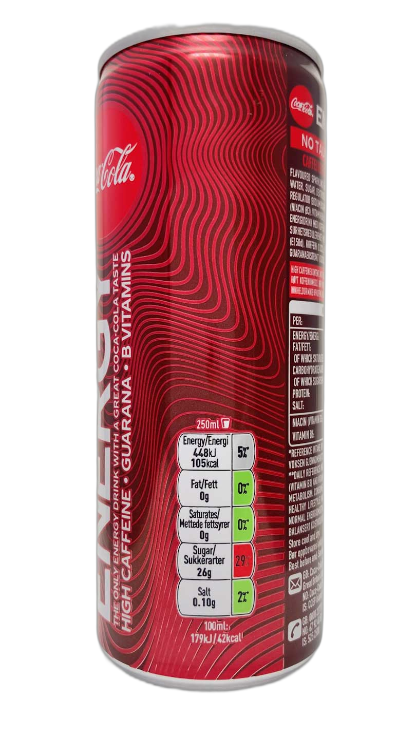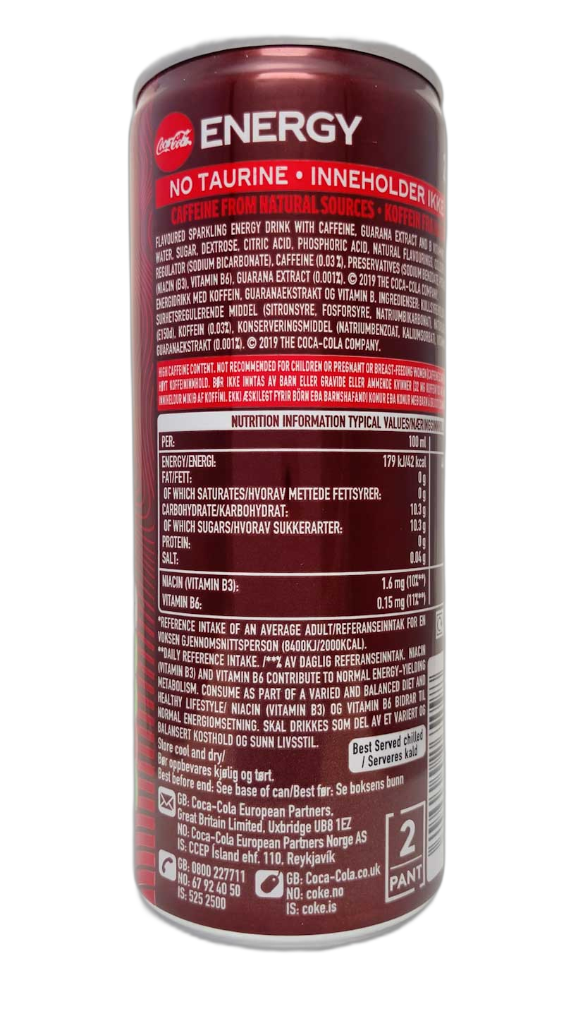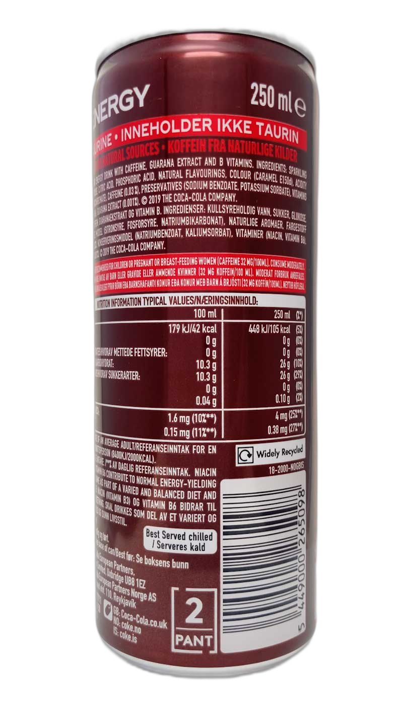 This can design is pretty much the same as the zero sugar equivalent but with a dark red background to the back of the can rather than black. It’s pretty simple and works as intended, giving extra energy to the usual coke red branding but it doesn’t inspire anything in me. The fact that they’ve used one can design for three territories just makes the back of the can look a mess as they squeeze in the multiple languages everywhere.