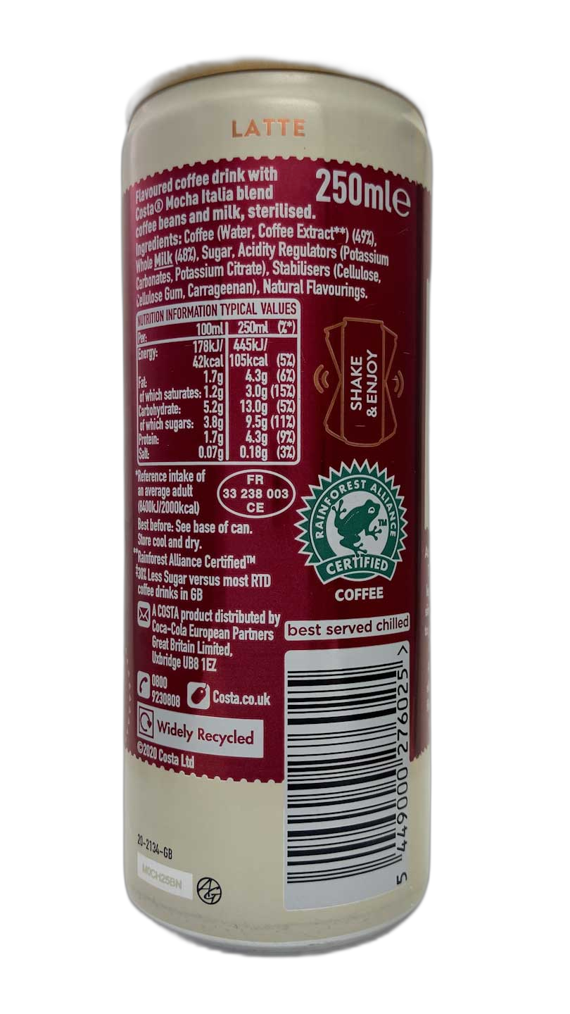 Our smooth and creamy Latte has been expertly crafted by our Master of Coffee. Made with less sugar‡ to release the full flavour of our Signature Mocha Italia beans, it’s your deliciously creamy Costa Coffee on the go. (‡ 30% less sugar versus most RTD coffee drinks in GB)