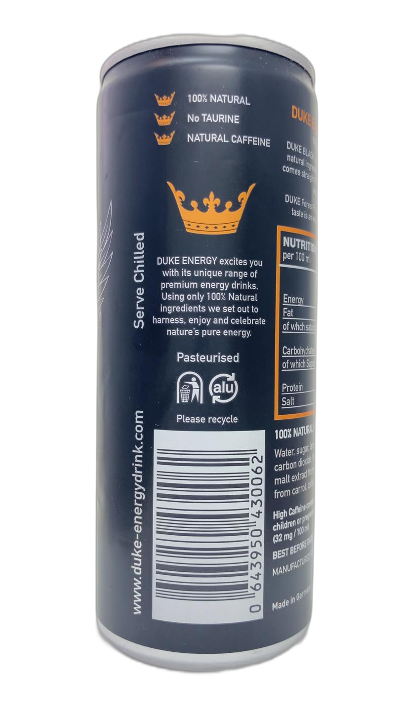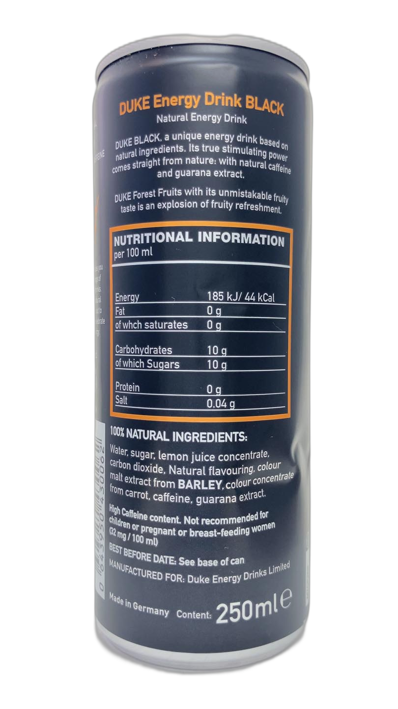 DUKE BLACK, a unique energy drink based on natural ingredients. Its true stimulating power comes straight from nature: with natural caffeine and guarana extract.