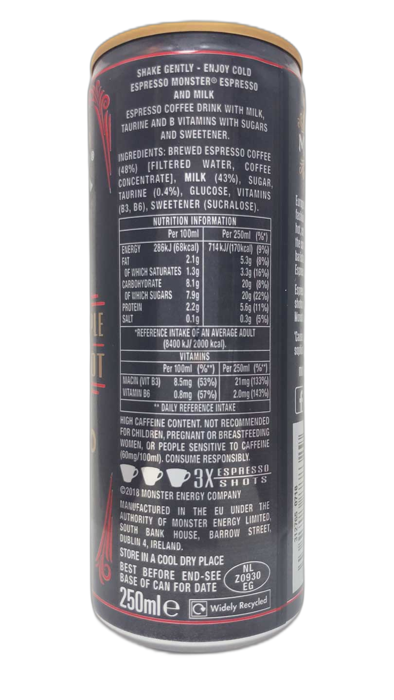 I suppose this could be considered the “original” Espresso Monster but there’s not much to separate the 3 Espresso Monster cans apart. Each has a different colour theme and a different image to the bottom right of the front of the can but other than that they’re pretty much the same. It gives the range a nice cohesive look but leaves me without a lot to say.