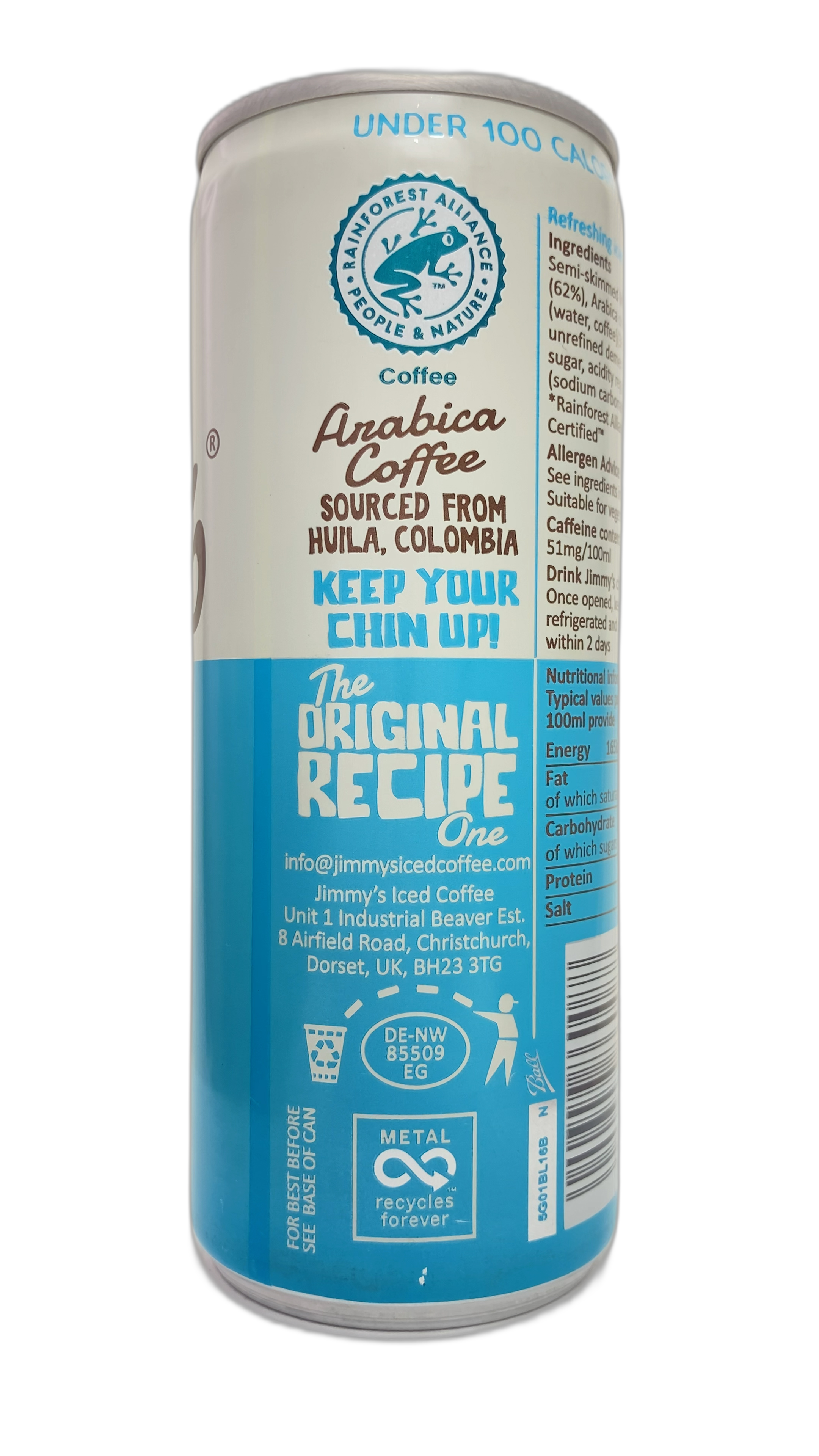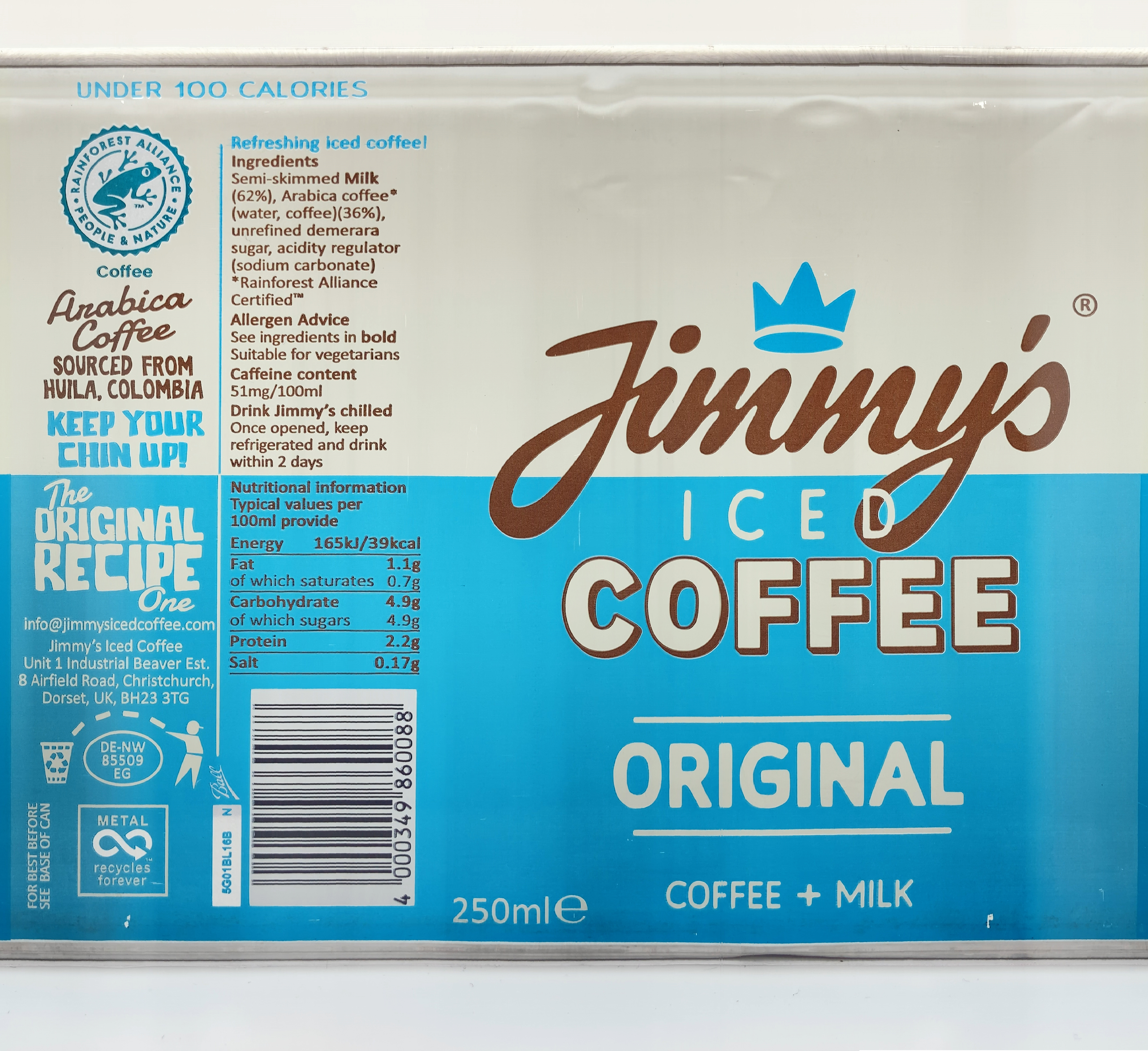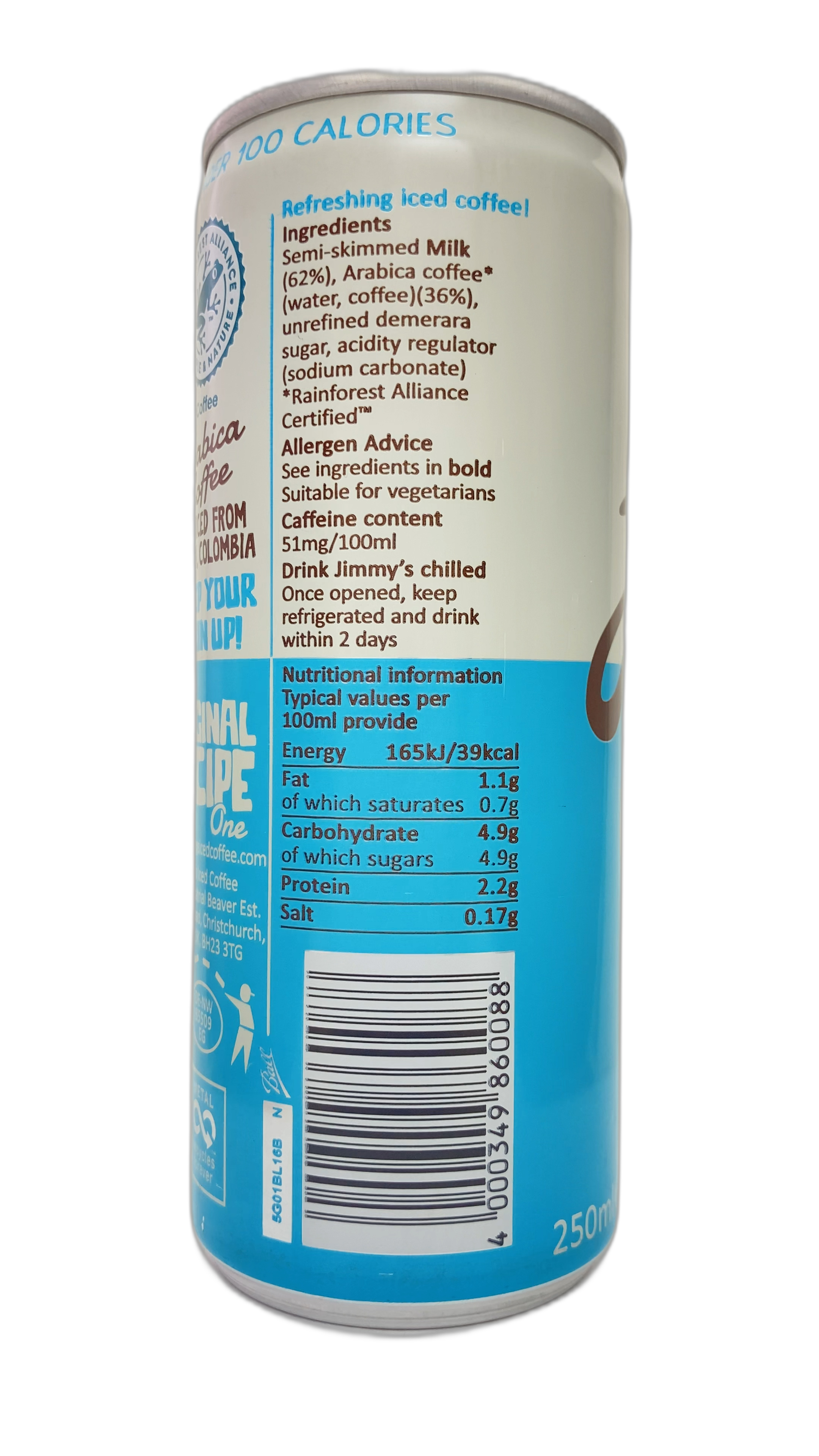 Jimmy’s seem to work as a name for an informal, pally product and that’s how this comes across with the range of about 4 different informal/friendly fonts used on the front of the can and a couple more on the back. I would query why the bottom half of the can is blue but I guess that works with the word “iced” and differentiates it from the brown can that’s used for the mocha variety.