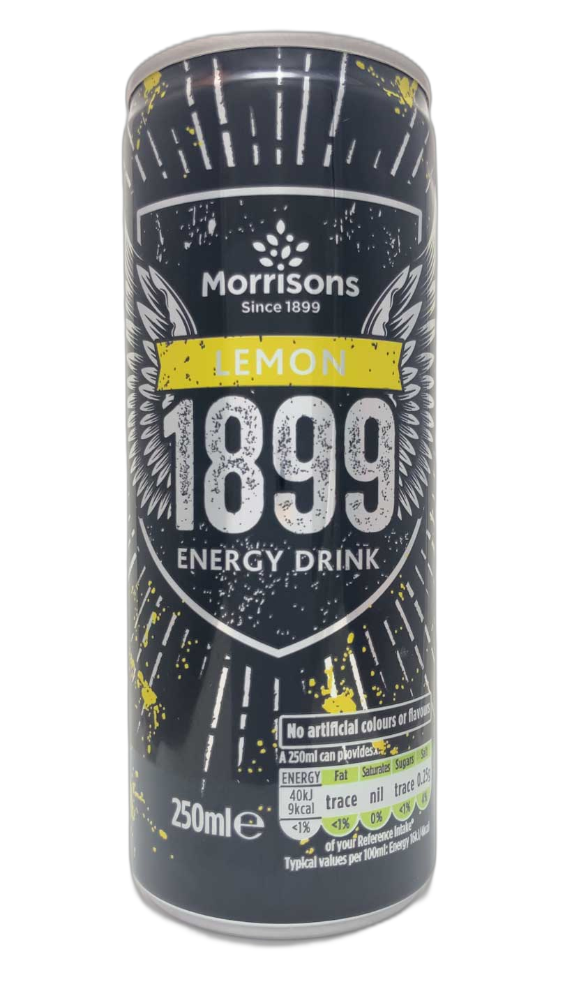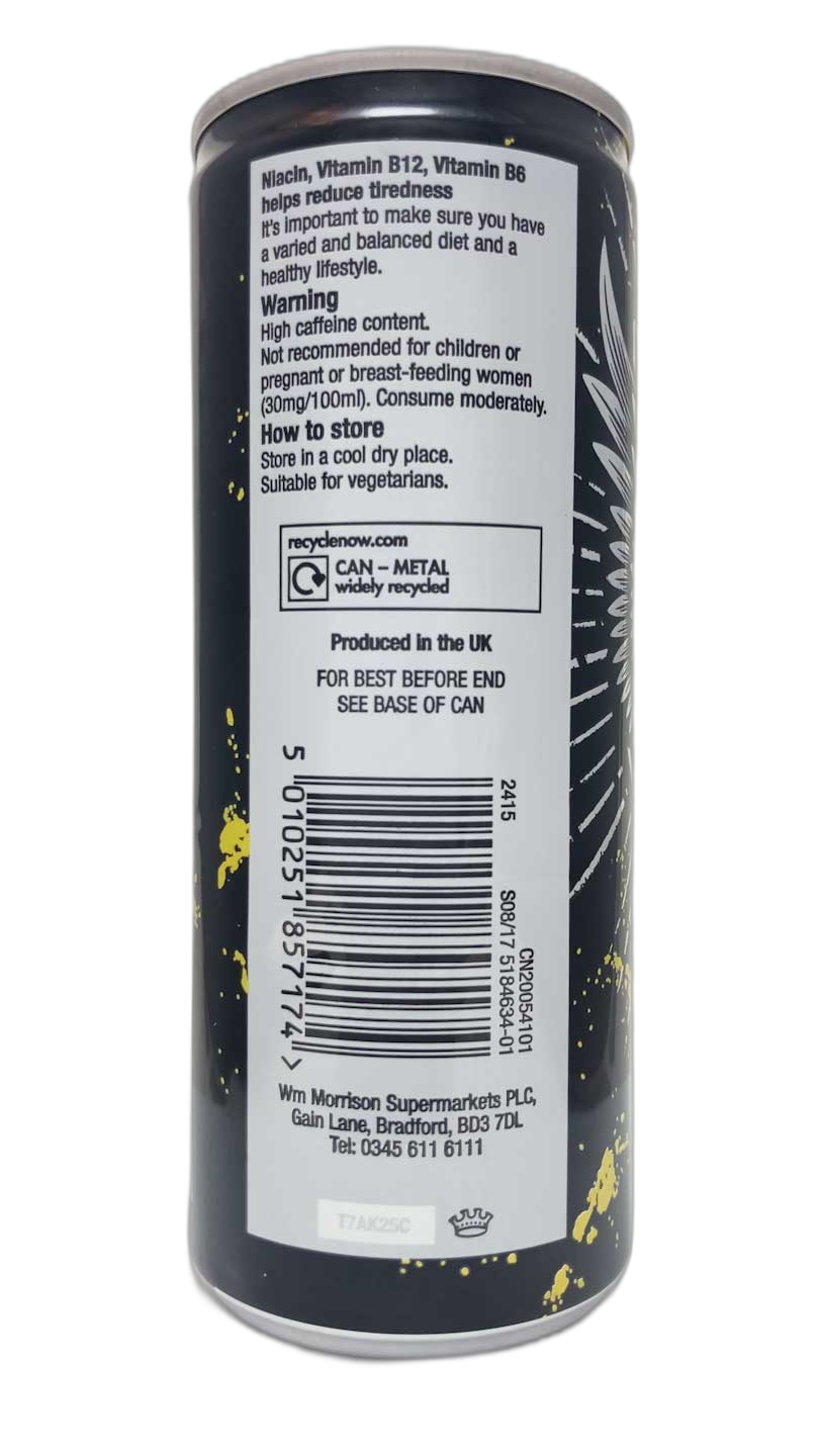 Own-brand cans seems to fit into one of two categories, utilitarian or stylistic. This is one combines a little bit of each, the back of the can is just two white rectangles which is a little boring but I can forgive that as the front of the can is really nice. I only just noticed this but 1899 is the year UK Supermarket Morrisons was founded (It’s right there in the logo above the word “lemon”). This design is simple but really effective, I love the distressed look to it all, the tattoo-like shield and feathered wings and the simple light-ray background all work really well together. There’s just enough colour included in the flavour bar and the “paint splats” to give it interest while also conveying the flavour of the drink inside. Overall, a really nice can for an own-brand energy drink.