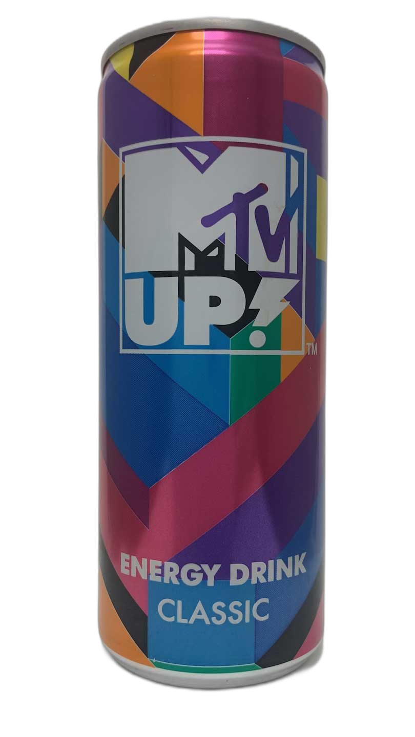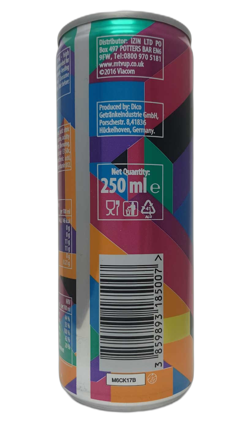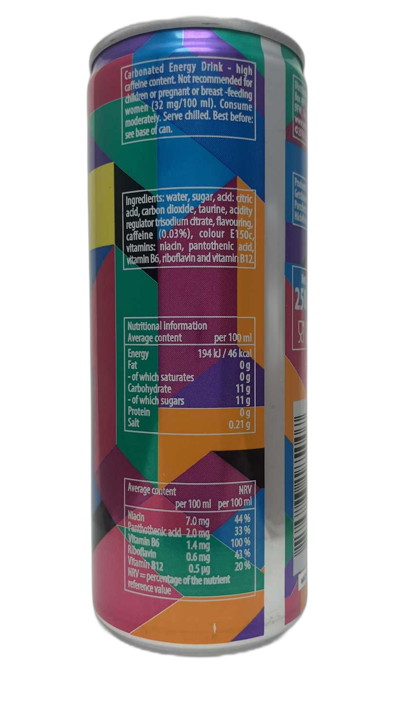 I don’t really know much about this can, including where I got it from. In researching it I tried the website listed on the back of the can, http://www.mtvup.co.uk and that no longer exists, however http://mtvupenergydrink.com does and shows a can pretty much the same as this one. I suspect this means that this can is still produced in the USA but not in the UK any more. It feels almost like this was a TV Channel or Program tie-in product but I have nothing to back that idea up. I love the bold geometric and colourful design of this can and I even quite like the separate boxes of info on the back which continue the geometric design.