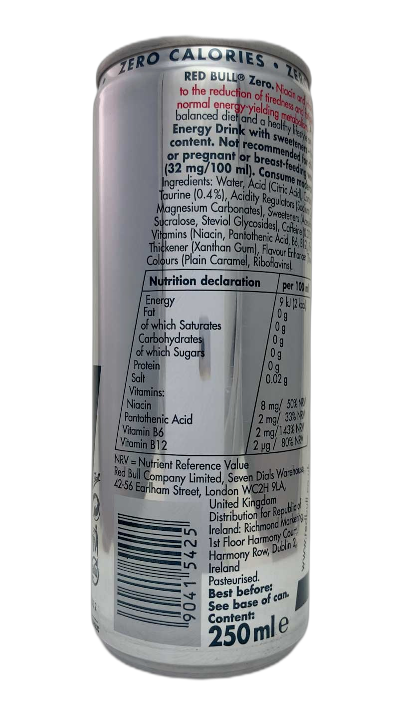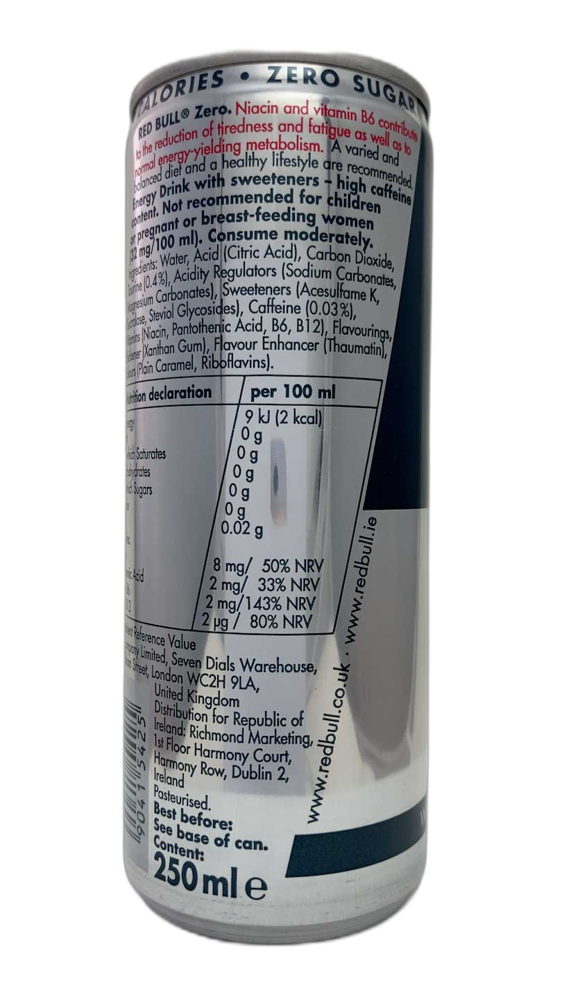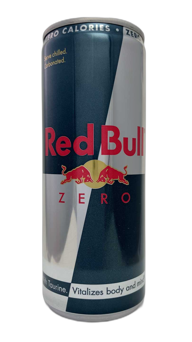 Red Bull have gone for the convention of zero being black and gone for a very dark grey here. It feels almost dark blue but I think this is a trick of the brain. With the subtle “Zero Calories. Zero Sugar.” band around this top this is a pretty good but not particularly outstanding can design.