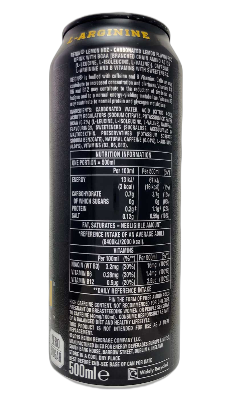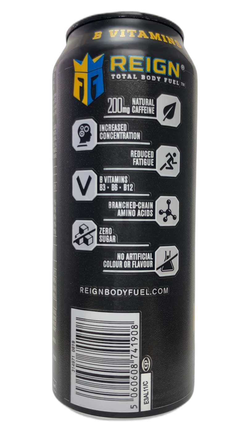 Despite its simplicity I really like this design. It has a really bold logo and really bold text rendered in two contrasting colours, with the colours (in this case yellow with blue as a nice contrasting shadow colour) related to the flavour of the drink inside. The plain black background is a stark contrast to the complex background patterns of the Monster Ultra cans but is similarly nice and subtly textured. The text on the back is almost an identical layout to the monster cans but hides behind a different company name.