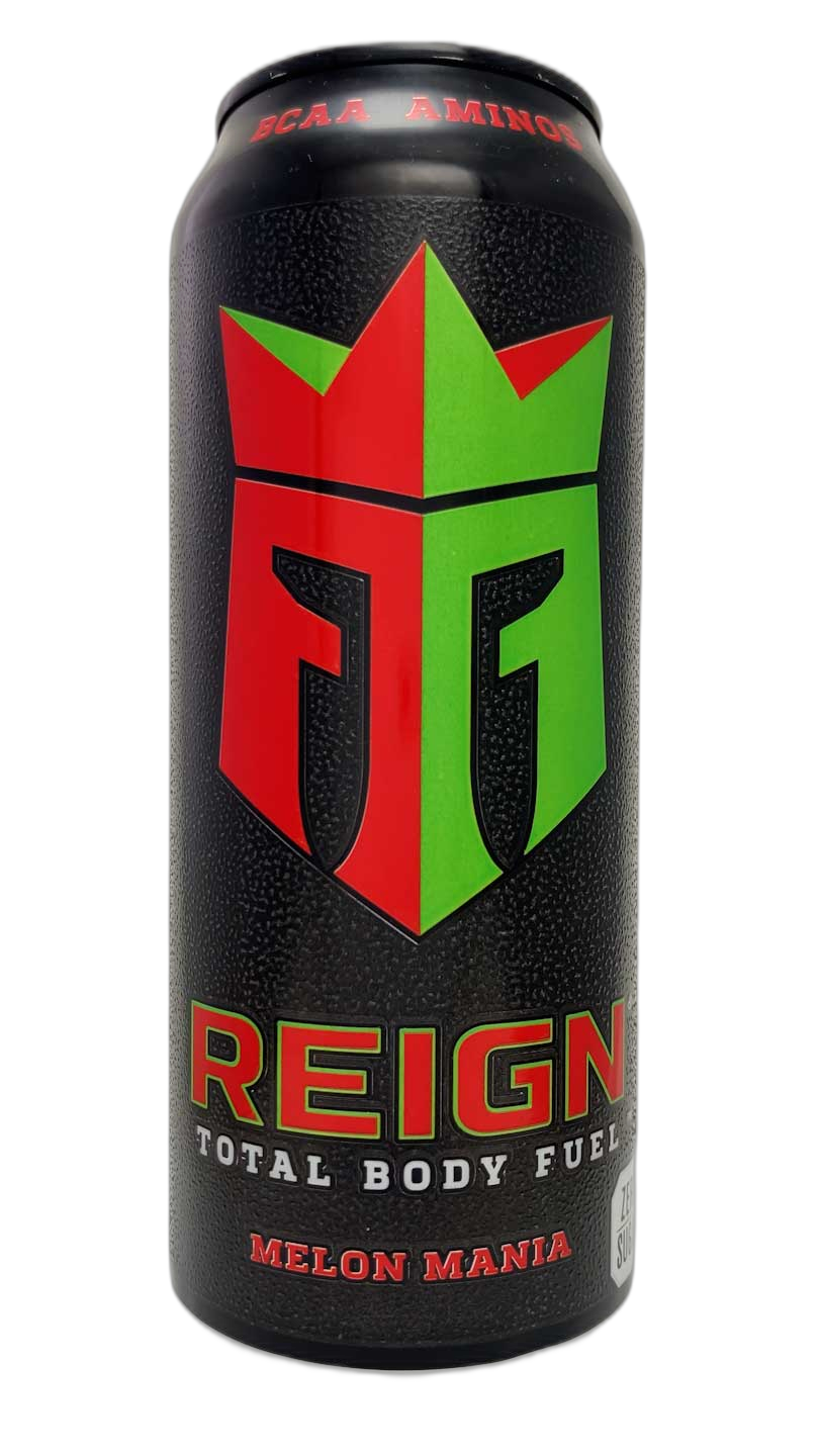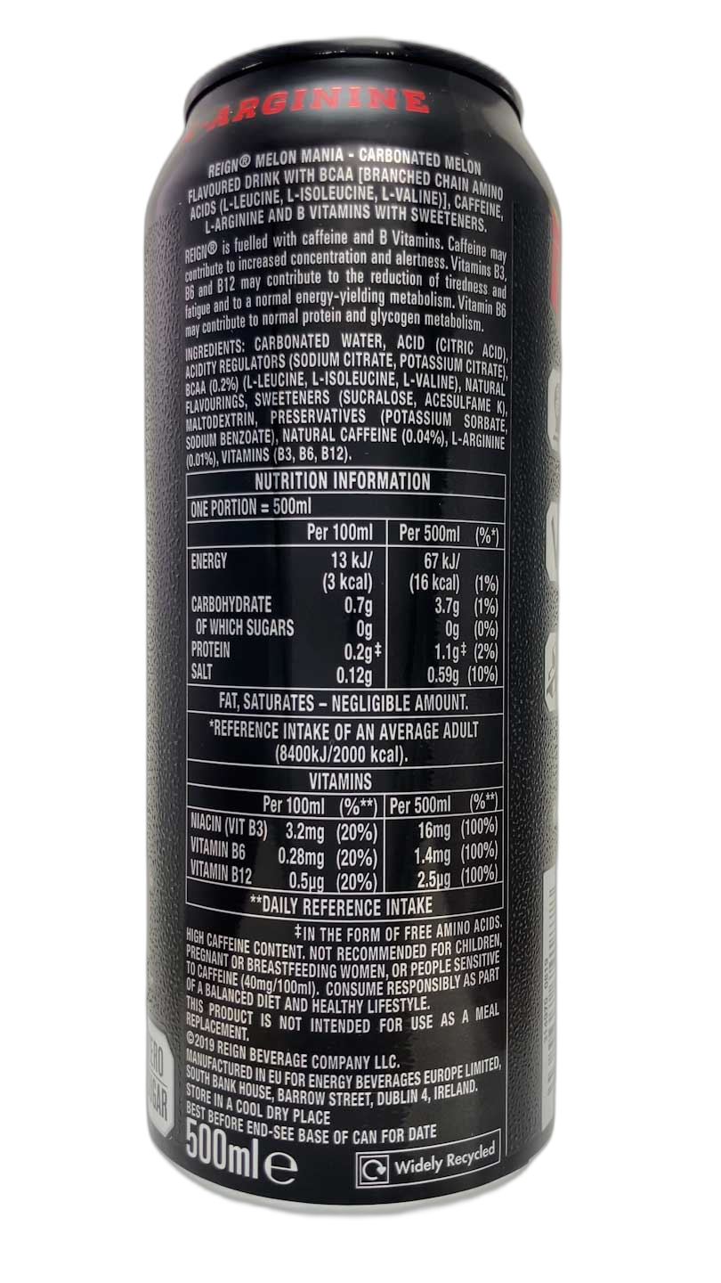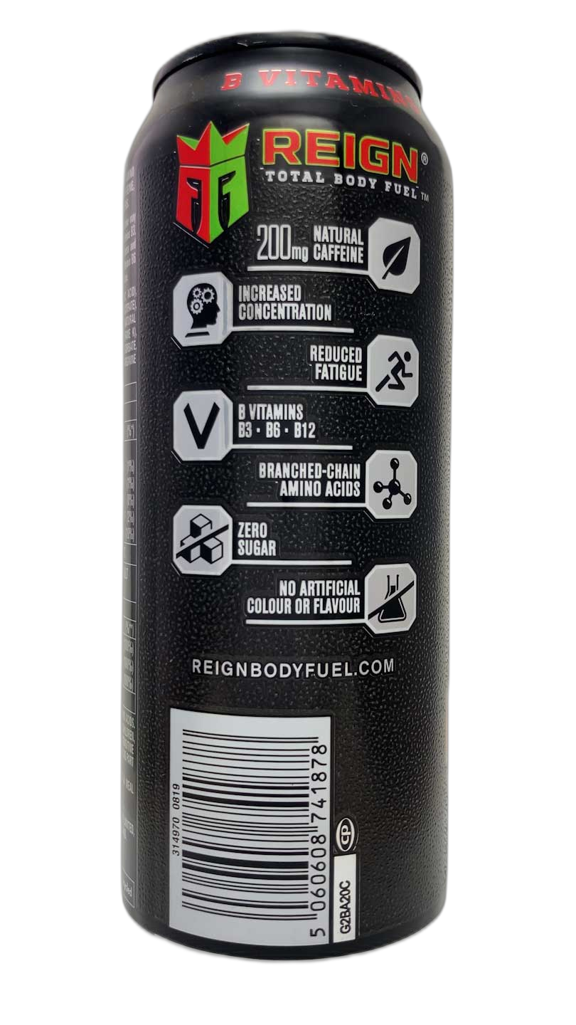 Despite its simplicity I really like this design. It has a really bold logo and really bold text rendered in two contrasting colours, with the colours (red and green for the flesh and skin of a watermelon) related to the flavour of the drink inside. This gives echoes of the Boost cans with their penchant for re-using the same design but re-colouring it for each different flavour. The plain black background is a stark contrast to the complex background patterns of the Monster Ultra cans but is similarly nice and subtly textured. The text on the back is almost an identical layout to the monster cans but hides behind a different company name.