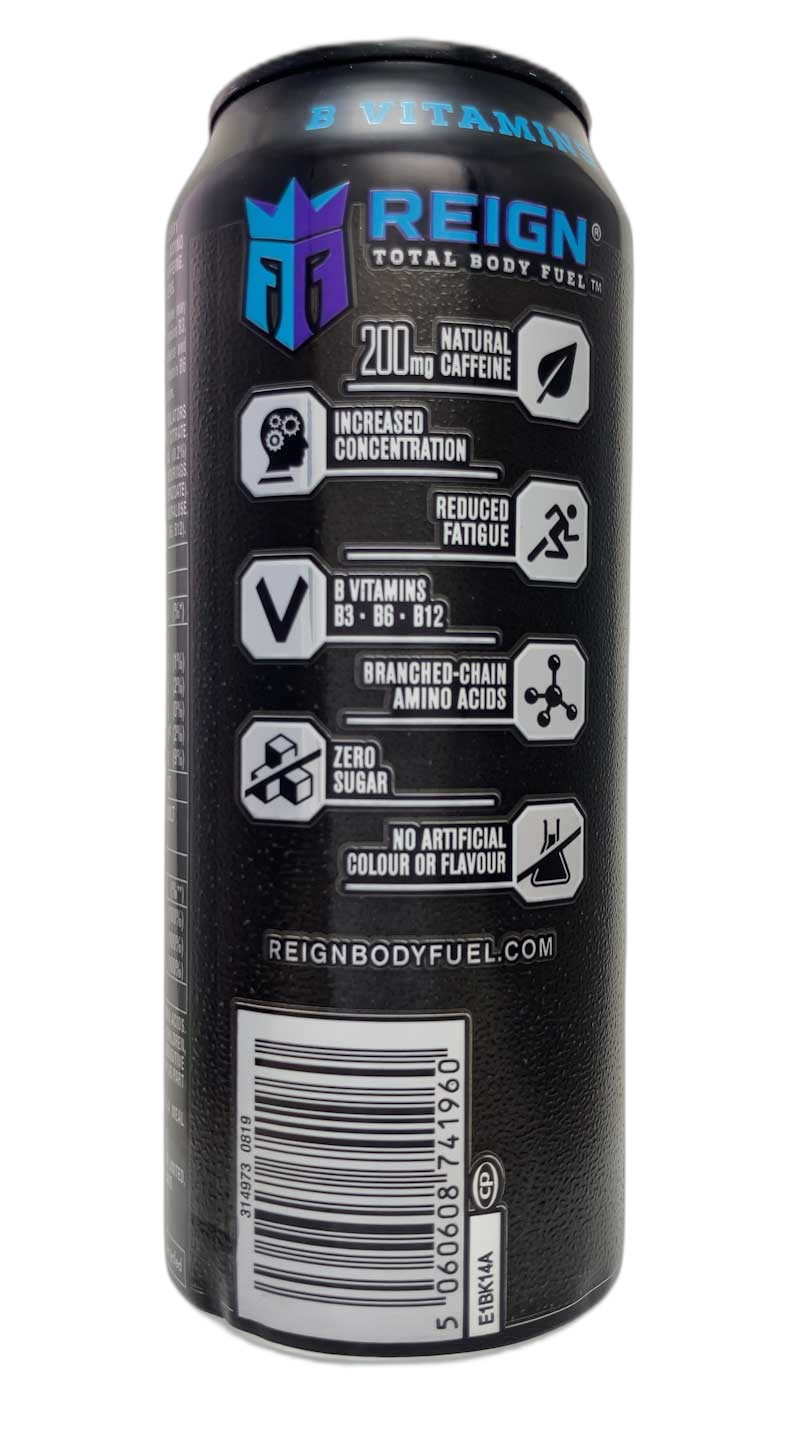 Despite its simplicity I really like this design. It has a really bold logo and really bold text rendered in two contrasting colours, with the colours related to the flavour of the drink inside, in this case, blues and purples for mixed berries. This gives echoes of the Boost cans with their penchant for re-using the same design but re-colouring it for each different flavour. The plain black background is a stark contrast to the complex background patterns of the Monster Ultra cans but is similarly nice and subtly textured. The text on the back is almost an identical layout to the monster cans but hides behind a different company name.
