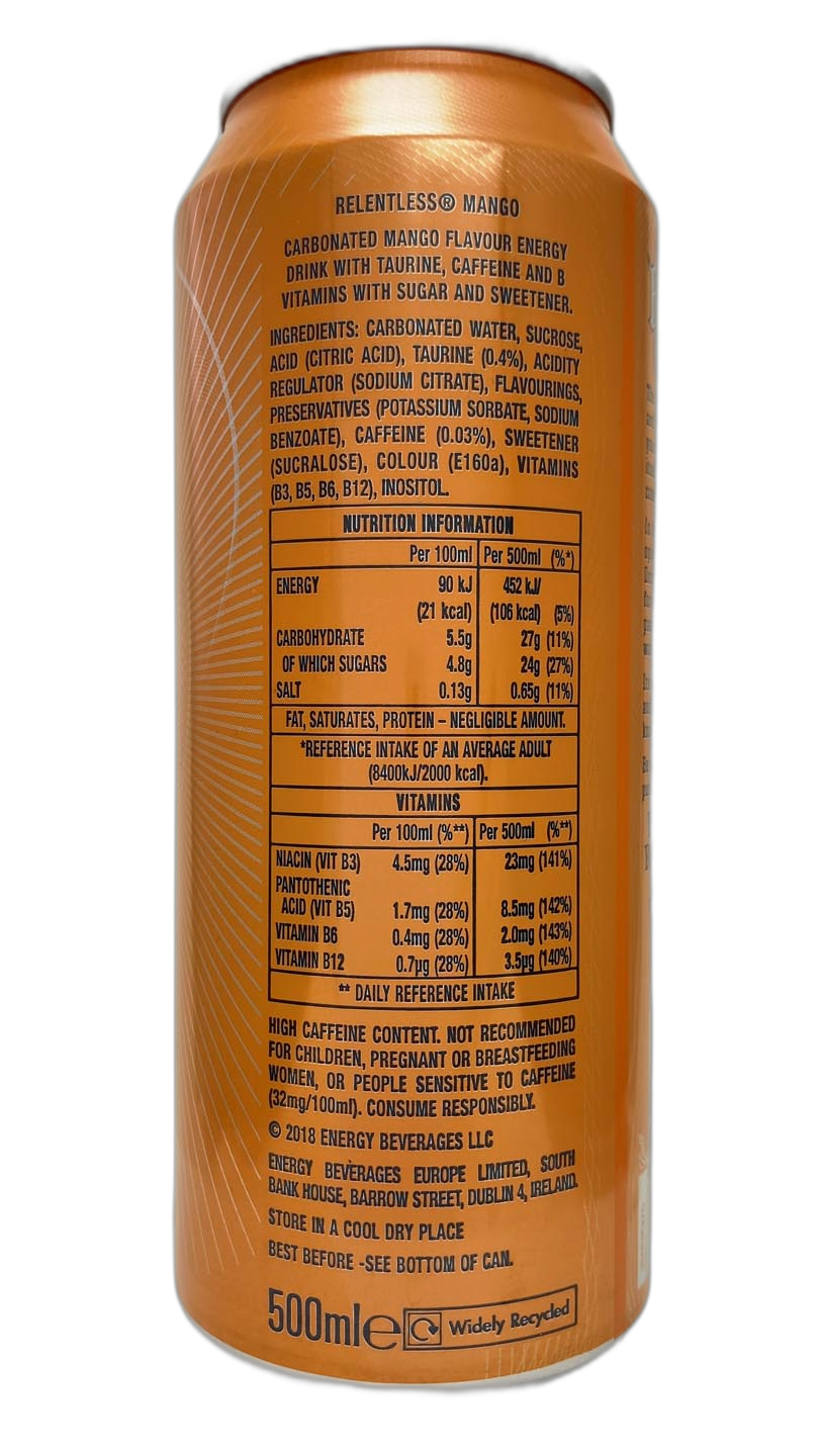 This is the first Relentless can I’ve added to the online catalogue but I do have a sentimental attachment to Relentless Origin as it got me through lots of University. The can is a delightful mix of complex and simple with the raven design being almost banknote design detail complimented by the relatively simple background radiant spiral. I like this design and it’s a sensible choice of colour for mango.