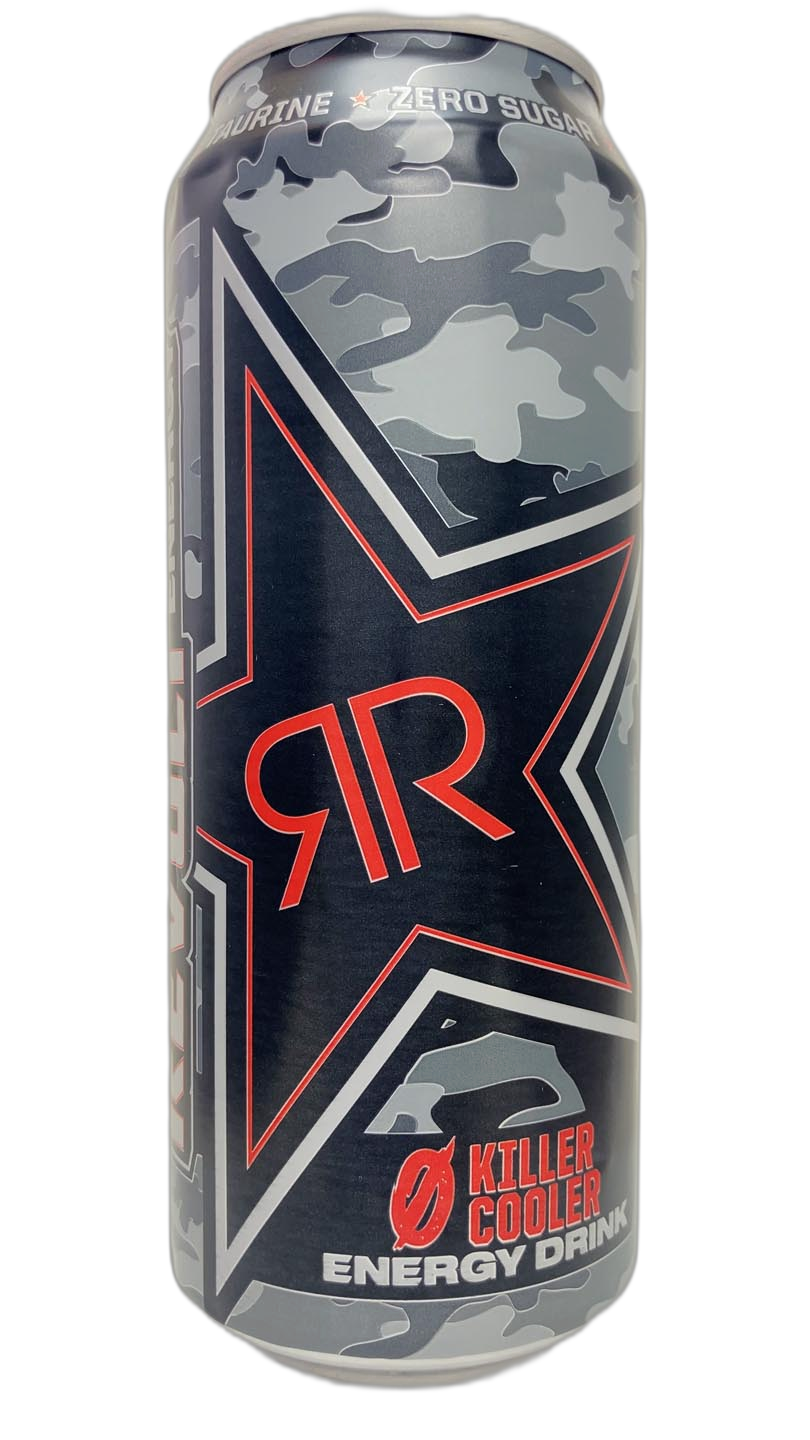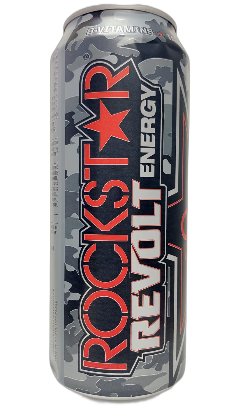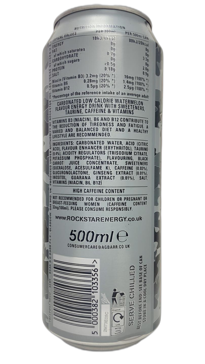 This is a very busy can with its large main elements but that’s about standard for Rockstar cans. I like the camo background design … as long as I don’t look at it too closely. If I spend too much time looking at the background it starts to look blocky and amateurish, but I guess no-one’s meant to study these cans in detail. The bold rockstar logo doesn’t make the can look pretty or striking or anything like that but it’s nice and functional … apart from not actually telling the buyer what the flavour actually is unless you read the small print on the back.