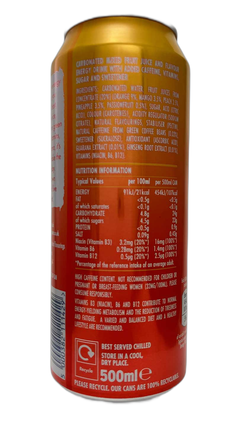 The design of this can is quite simple but really effective. The massive word Raw is possibly a little on the large side, but with those two little points over the A and W I think they’re aiming to give the idea of a range of mountains, alluding to the ’natural’ aspects of the drink, along with ‘Raw’ potentially meaning ‘unprocessed’ (which may be a long shot for an energy drink). It’s good that they put the word ‘Energy’ on the front of the can, otherwise it wouldn’t be clear from the rest of the design.