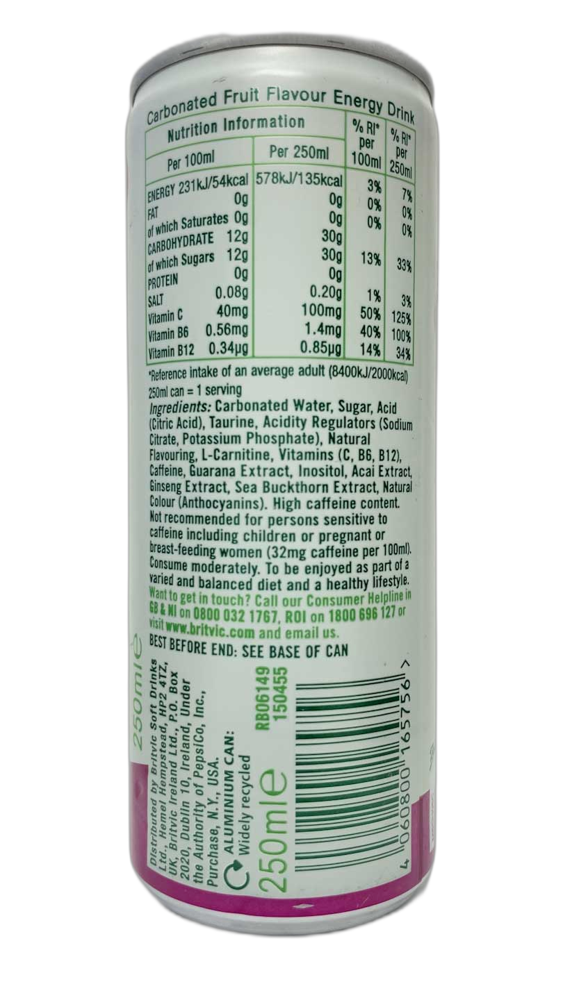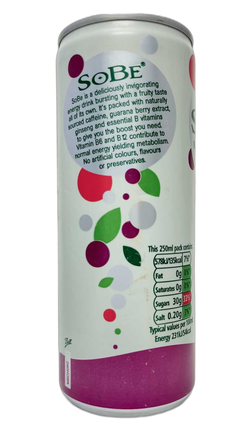 SoBe is a deliciously invigorating energy drink bursting with a fruity taste all of its own. It’s packed with naturally sourced caffeine, guarana berry extract, ginseng and essential B vitamins to give you the boost you need. Vitamin B6 and B12 contribute to normal energy yielding metabolism. No artificial colours, flavours or preservatives.